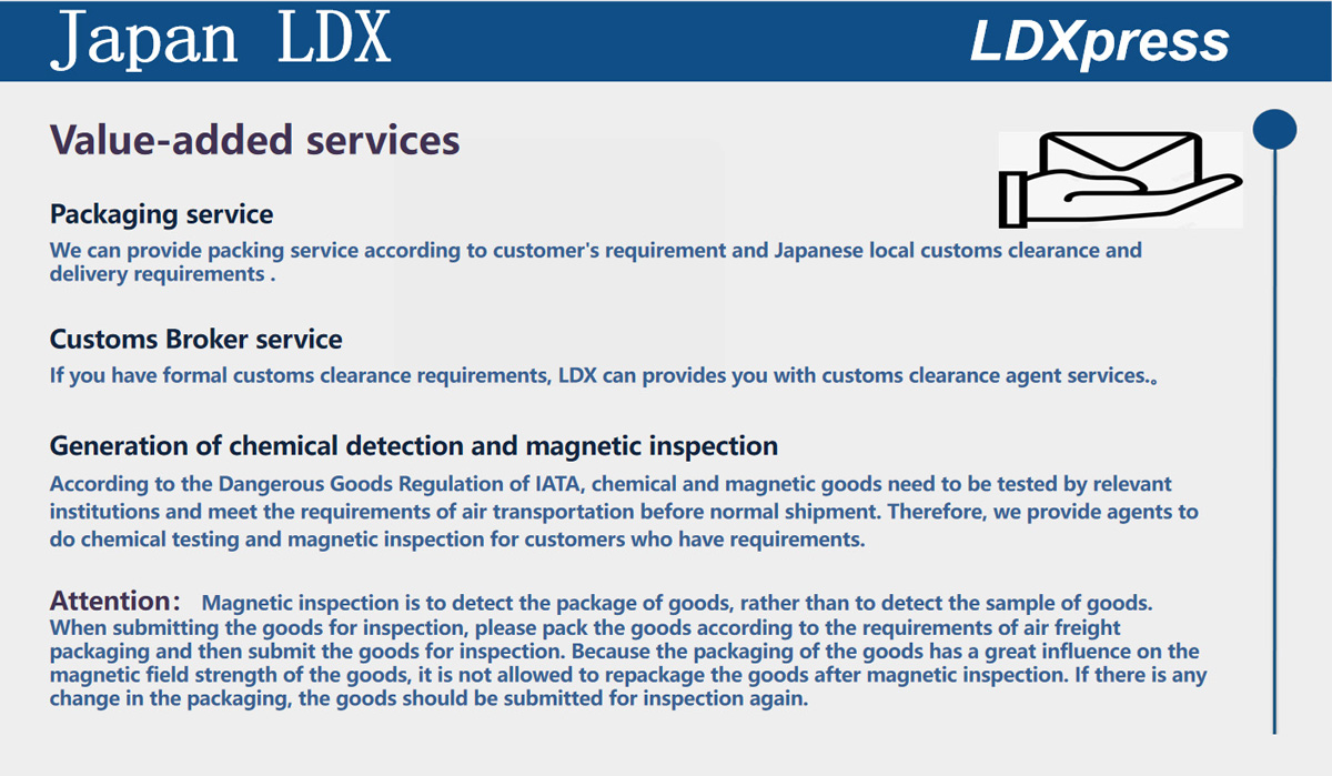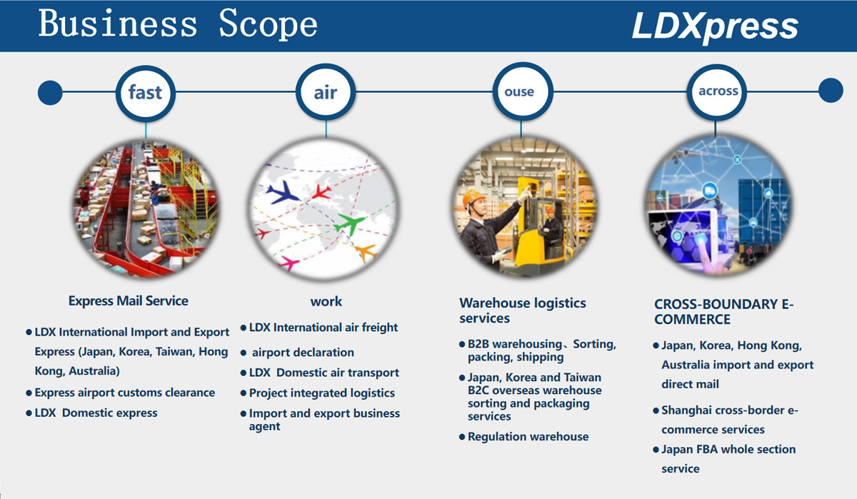 Established in 1997, LDX focus on the international express import and export agency business ( Japan Korea Taiwan Hong Kong Australia ), which includes express airport customs declaration and supervision warehouse, domestic air transport ,comprehensive logistics , B2B warehousing, sorting and packaging, transport, direct services for cross-border e-commerce,FBA segmental service in Japan, Korea, Australia e-commerce small package import and export customs clearance service.