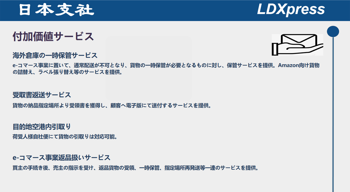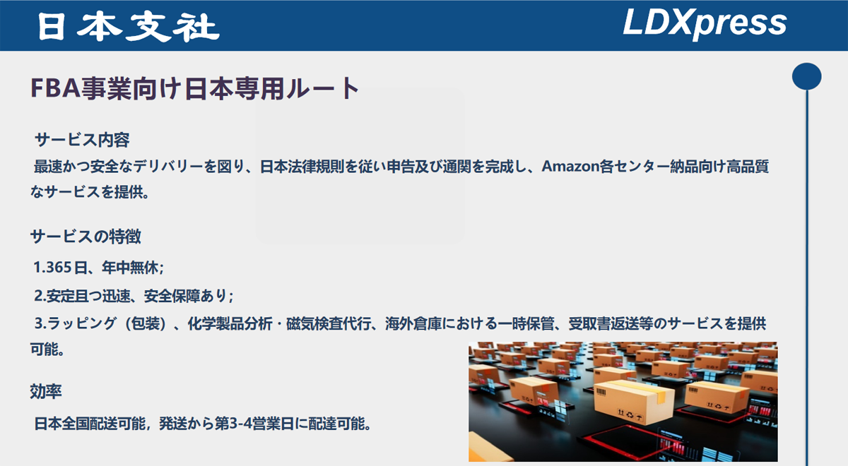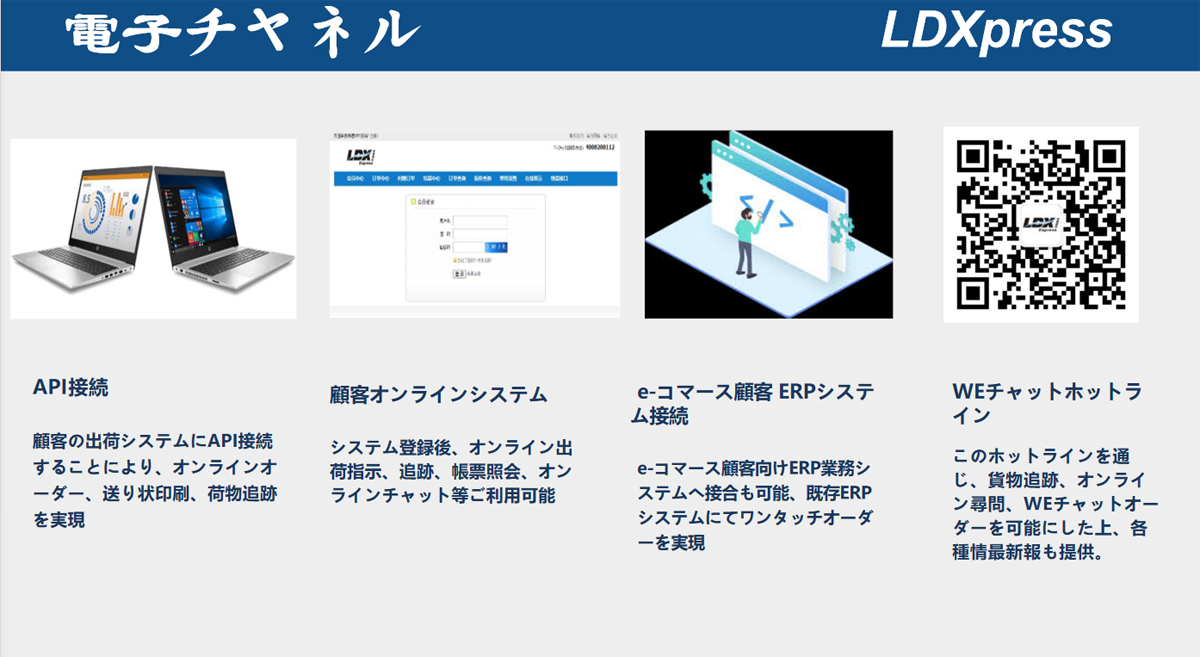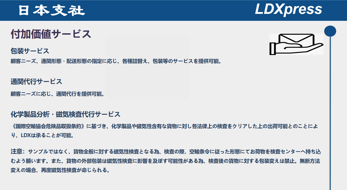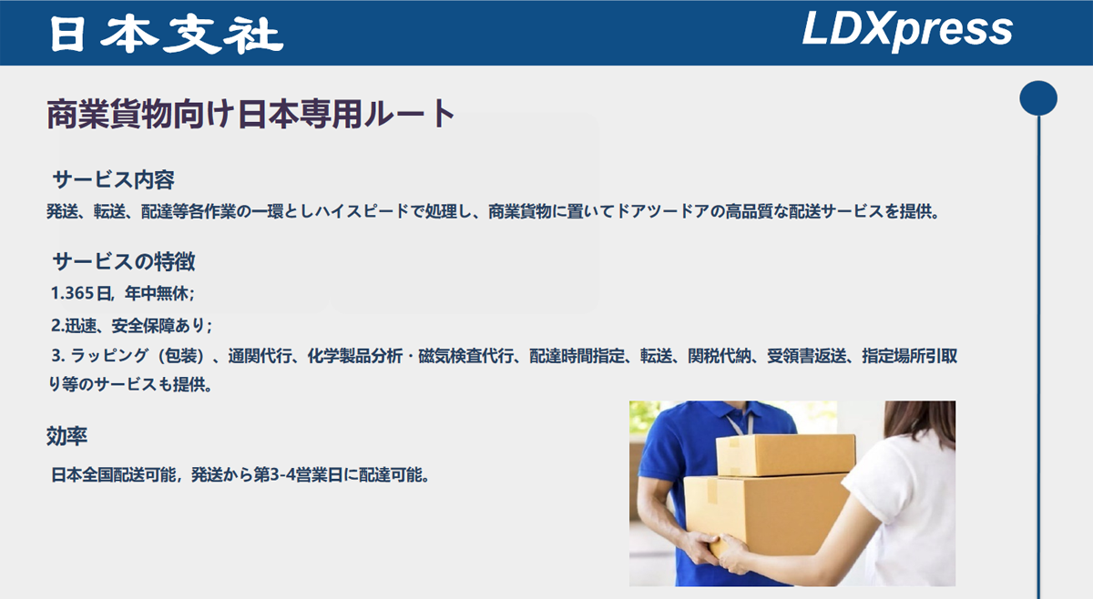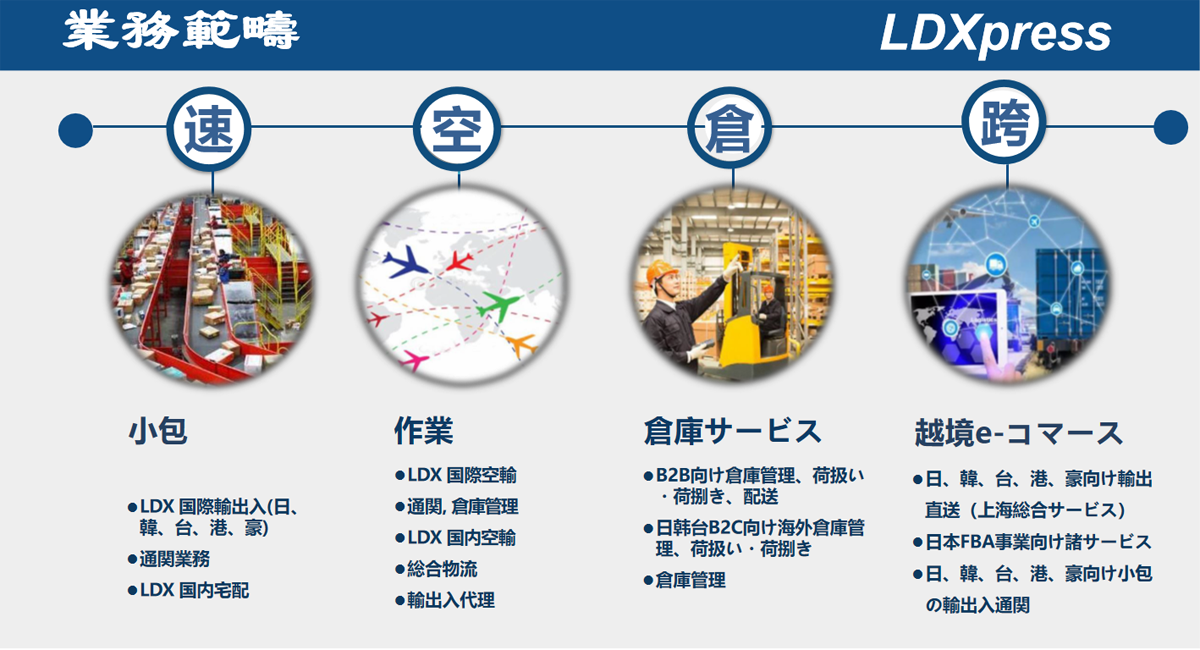LDXとして、國(guó)際貨物輸送?配送に置いて豊な経験を持ち、HUBシステムを通じて優(yōu)良サービスを提供していると業(yè)界で好評(píng)が相次ぐ。また、物流専用システムにて遠(yuǎn)距離コントロール?追跡が実現(xiàn)し、荷物の輸送から配達(dá)?荷受までの過(guò)程に全機(jī)能を備え付けている。